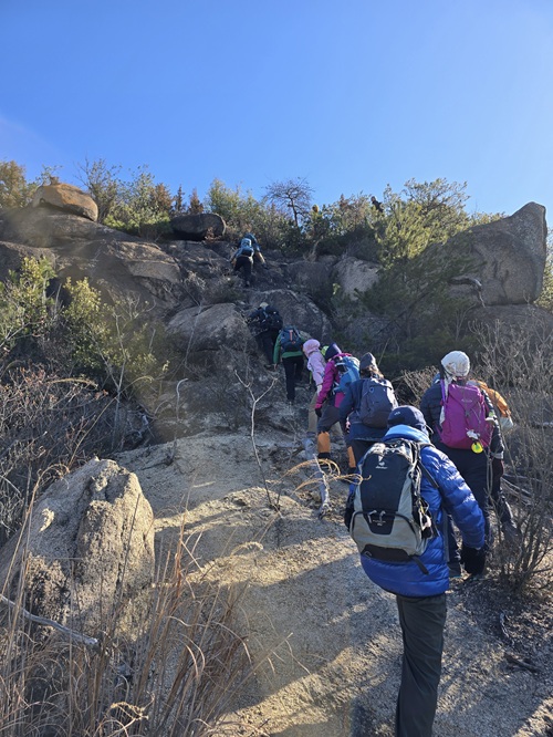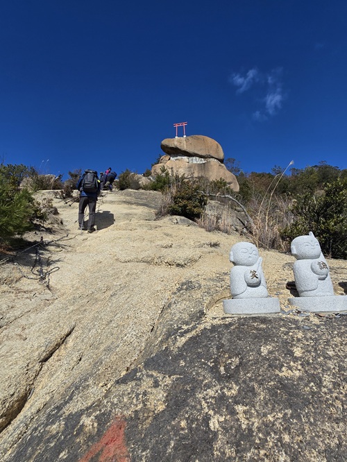 玉野市の深山公園に現地集合。駐車場から水生植物園を経由し、天狗山東尾根分岐で稜線に合流した。壁のように立ちはだかる急登の岩場を越えて、天空の鳥居に到達。さらに急下りを経た先の観音寺でやっと昼食。