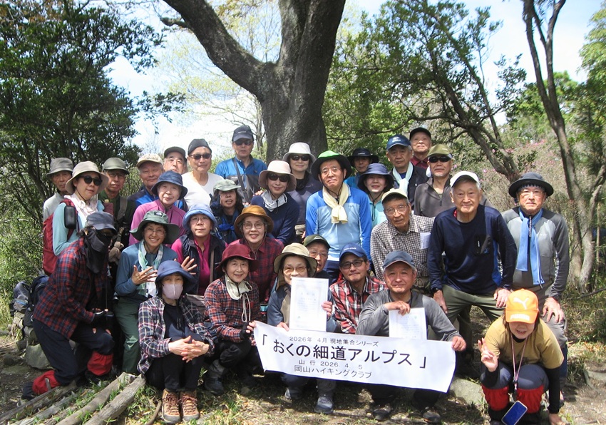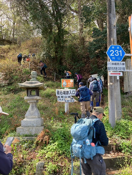 スタートは、岡山城下町の礎を作った宇喜田直家ゆかりの砥石城(標高100m)、急登を登り切った本丸跡から、松山、ダンガメ山、大雄山と100~180m級の低山が続くご当地アルプスを縦走した。