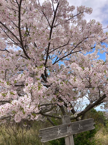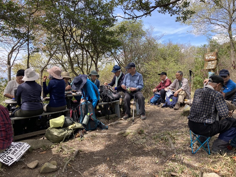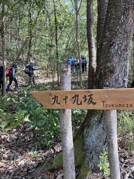 長谷越分岐を過ぎると、本日の最高峰ダンガメ山(標高184m)。ランチの後は、キャンプ場まで下り、さらに九十九坂の急登を上り返し、大賀島寺・大雄山と名残の桜を楽しむ・・